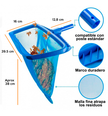 El Sacahojas Profesional con bolsa profunda es ideal para mantener tu pileta limpia de hojas y residuos. Fabricado con una red de malla azul resistente y un marco reforzado, ofrece gran durabilidad y eficiencia.