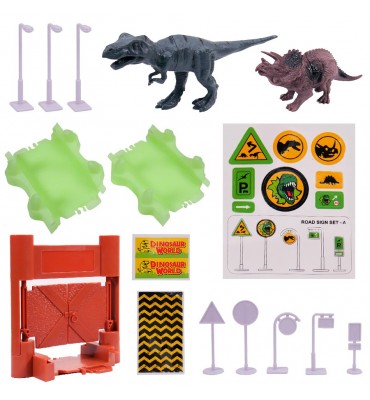 El set incluye un auto de carreras que se desliza por la pista, dos dinosaurios que añaden emoción al entorno, tres postes de luz, 5 señales de tránsito decorativos y 13 stickers de señales de tránsito para añadir emoción a la pista de carreras, una puerta de entrada, 2 stickers de cartel y 4 stickers de seguridad para recrear un escenario jurásico. La combinación de estos elementos permite que los pequeños exploren escenarios únicos y creen historias llenas de acción y diversión.