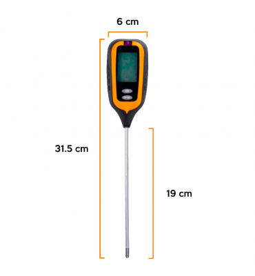 Con un rango de temperatura que abarca desde -9 hasta +50°C y una precisión de 1°C, el medidor es adecuado para diversas condiciones climáticas. Su capacidad de medir el pH del suelo en un rango de 4.0 a 9. permite evaluar la acidez y alcalinidad, factores cruciales para el desarrollo saludable de las plantas. La sonda de 20 cm de longitud facilita el acceso a diferentes capas del suelo, brindando lectura.