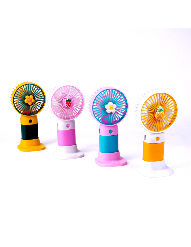 Este modelo se destaca por sus 4 diseños adorables, cada uno con colores y un aplique decorativo distinto (florcita, frutilla, piña, etc.), pensados para quienes buscan un ventilador funcional pero también tierno y decorativo. Son perfectos para regalar o coleccionar.