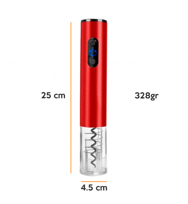Este sacacorchos funciona con pilas AA, lo que lo hace portátil y fácil de utilizar en cualquier lugar sin necesidad de cables. Con un peso de 328 g y medidas de 250 mm x 45 mm, resulta compacto, equilibrado y muy cómodo de manipular.