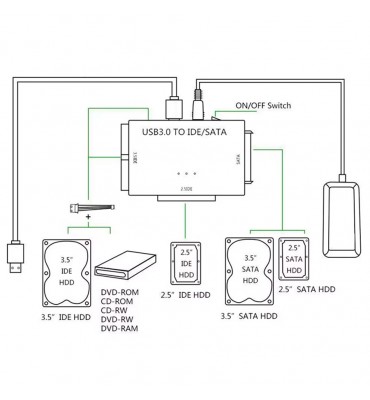 Este conversor USB 3.0 a SATA / IDE te permite conectar discos duros IDE / SATA de 2.5 "/ 3.5" a su computadora a través del puerto USB. Esta es la herramienta perfecta para duplicar, copiar, respaldar o transferir una gran cantidad de datos de una unidad a otra.