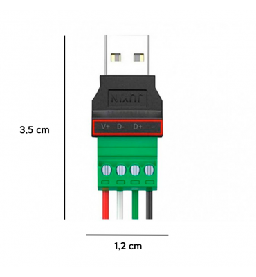 - Conector: USB 2.0 Tipo A macho a bloque de terminales de tornillo (4 pines).