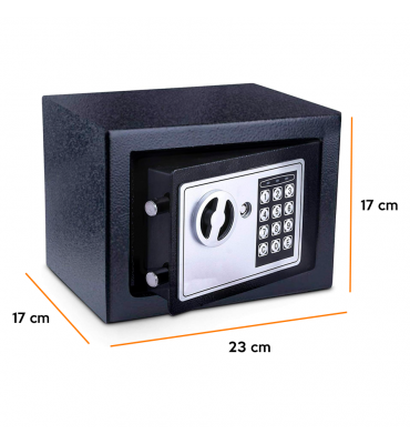 Esta caja fuerte es ideal para guardar dinero, joyas, documentos importantes y pequeños artículos de valor. Con dimensiones de 17x23x17 cm, es una elección confiable para quienes buscan seguridad adicional en sus espacios personales o laborales.