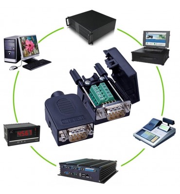 Compatible con diversos dispositivos seriales como PLC, cámaras digitales y módems, este conector incluye placas de prensado de cables para mayor seguridad. Diseño intuitivo con puertos etiquetados para minimizar errores de conexión.