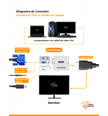 Este conversor tiene la función de convertir la imagen VGA a HDMI y por una salida miniplug sale el audio. Sirve para conectar cualquier dispositivo con salida VGA a un Monitor o Tv con entrada HDMI.