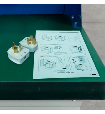 El diseño incluye un estante superior, perfecto para colocar suministros o herramientas de uso frecuente, asegurando que siempre estén a mano durante el trabajo. Adicionalmente, cuenta con orificios preinstalados para la instalación de tomas de corriente, lo que facilita el uso de dispositivos eléctricos sin tener que recurrir a extensiones adicionales, proporcionando mayor funcionalidad y comodidad en el día a día.