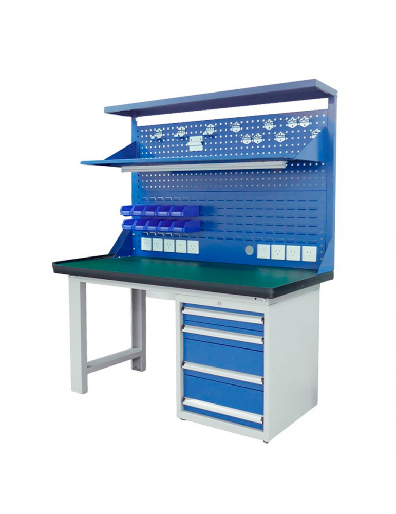 Este modelo incluye diversos elementos que maximizan su utilidad: dos vigas de soporte, un panel perforado para organizar herramientas, una cajonera de cuatro niveles para el almacenamiento de piezas pequeñas y un completo juego de accesorios, convirtiéndola en una estación de trabajo versátil y bien equipada.
