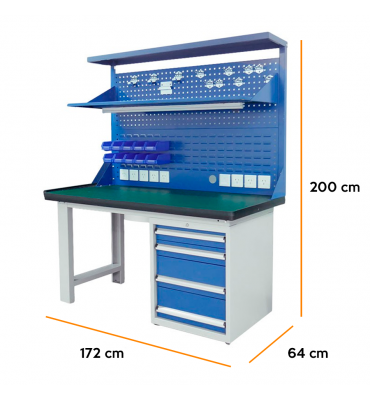 Con dimensiones de 172 cm x 64 cm x 200 cm, incluye un estante superior para herramientas, orificios preinstalados para tomas de corriente y un panel perforado para organizar tus herramientas.