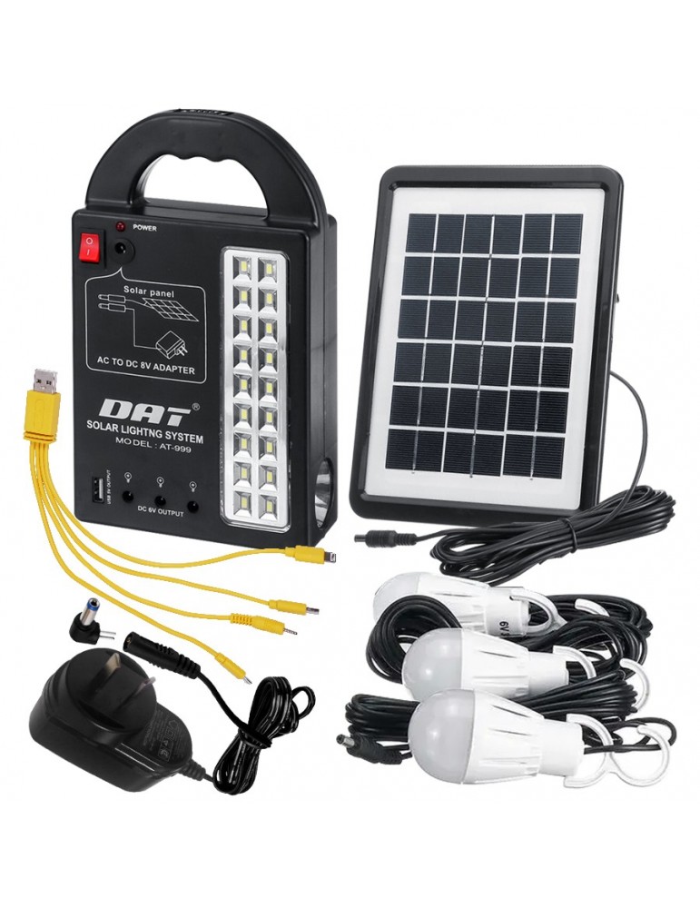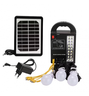 Generador De Energía Solar, Sistema Doméstico De 3 Bombillas Led, cable USB multi conector, ideal para uso al aire libre y como sistema de emergencia ante cortes de energía. Puede cargar celulares, GPS y otros dispositivos.