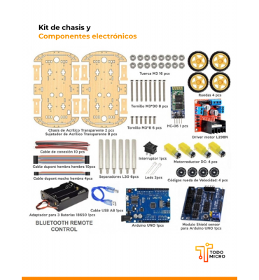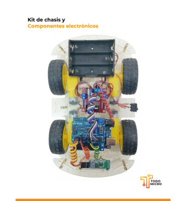 Este kit de chasis y componentes electrónicos está diseñado para entusiastas y estudiantes de robótica que deseen construir un robot 4WD (cuatro ruedas motrices) controlado mediante una aplicación móvil. Cada componente ha sido cuidadosamente seleccionado para ofrecer una experiencia de construcción y programación rica y educativa.