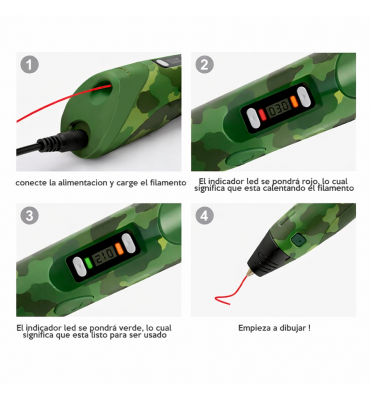 - El lápiz 3D trabaja con la temperatura aproximada según el material y se puede regular para cada tipo de filamento. Ni bien llega a la temperatura de trabajo aproximada, la luz led se pondrá en verde y te permitirá comenzar a usarlo.