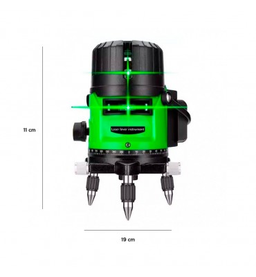Proyecta un láser verde potente en 3 líneas (1 horizontal y 2 verticales, formando ángulo de 90°). Incluye base metálica resistente con ajuste fino y trípode para máxima estabilidad, y cuenta con sensor de nivelación electrónico de alta sensibilidad (±4°), precisión horizontal de ±1mm/10m y vertical de ±1mm/5m.