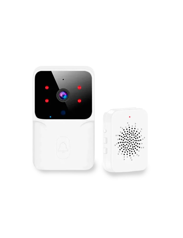 Cuenta con visión nocturna automática, cámara 480P, micrófono incorporado y 8 tonos configurables con 3 niveles de volumen. Fácil de instalar, sin cables, y alimentado por batería recargable de 3.7 V 600 mAh por USB.