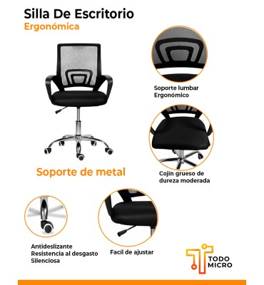 Diseñada para la movilidad y la comodidad, esta silla de escritorio con ruedas y función giratoria es un complemento perfecto para tus sesiones de trabajo, estudio o navegación por Internet.