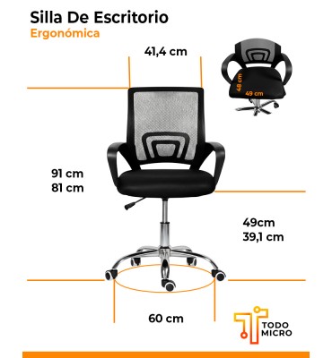 Perfecta para cualquier tamaño de oficina o habitación, esta silla cuenta con una base de 60 cm de diámetro, un respaldo de 41,14 cm de ancho y una altura ajustable de respaldo de 81 cm a 91 cm. Su asiento mide 48 cm x 49 cm, brindando versatilidad y facilitando su colocación en distintos espacios.